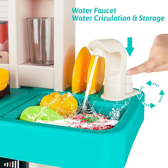- Educational Water Circulation System: Our Pretend Kitchen Play Sets suitable for toddlers Aged 3-5. Children can wash food, fruits, and dishes by pressing the button behind the water tap. The water in the sink will be recycled and reused from the faucet, the built-in water circulation system not only adds a touch of realism to their playtime but also understand the importance of water conservation.
