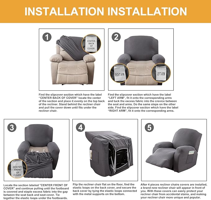 - Easy to Install: According to the user manual provided, this recliner chair cover is easy to install and has labels for the different cover positions. It's a quick and easy way to update the color or fabric of existing furniture, making it a great and affordable way to redecorate on a budget. It's perfect for families with kids, pets, or worn-out couches.