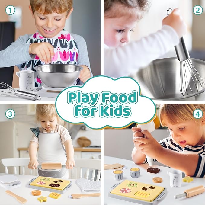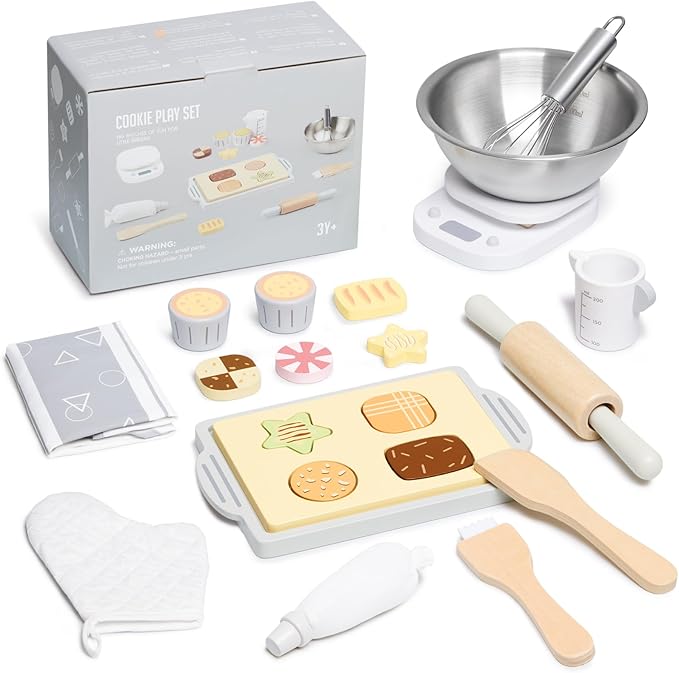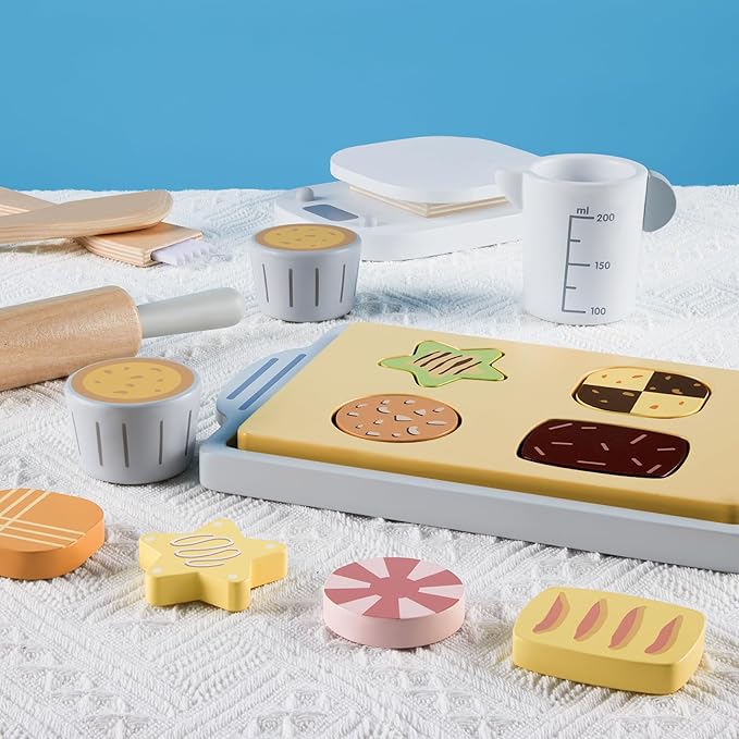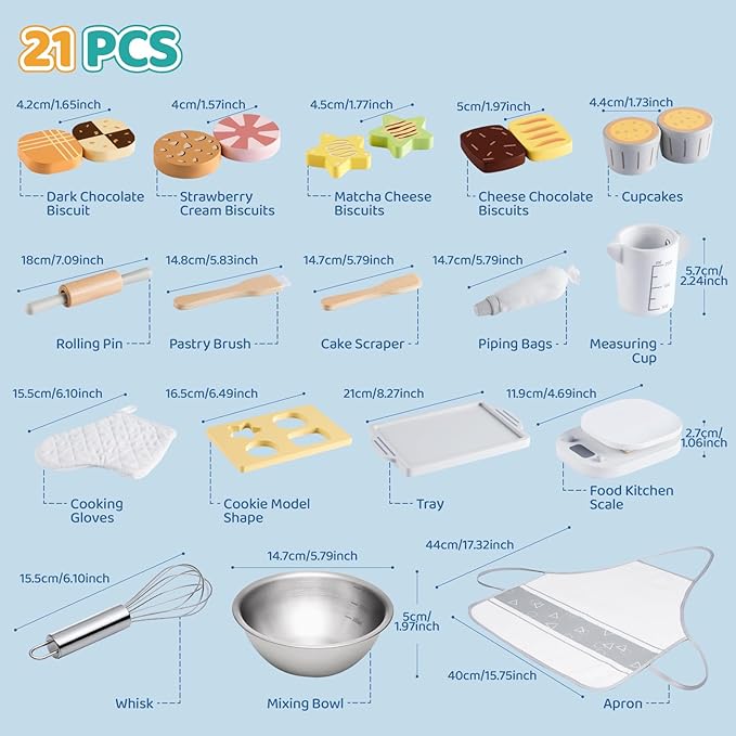- 【KITCHEN PLAY BAKING SET】: Each wooden kitchen accessories comes with 21 pcs fun and engaging pretend kitchen toys, include 2* Dark Chocolate Biscuits; 2* Strawberry Cream Biscuits; 2* Matcha Cheese Biscuits; 2* Chocolate Cheese Biscuits; 2* Cupcakes; 1* Rolling Pin; 1* Pastry Brush; 1* Cake Scraper; 1* Measuring Cup; 1* Food Kitchen Scale; 1* Piping Bag; 1*Cooking Glove; 1* Cookie Model Shape; 1* Tray; 1* Apron; 1* Whisk; 1* Mixing Bowl; 1* Apron. It provides endless hours of fun for children.