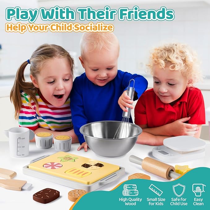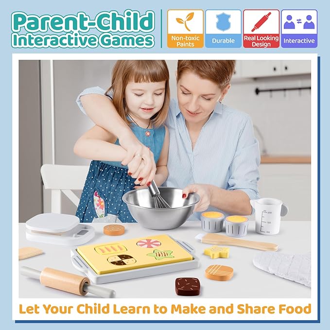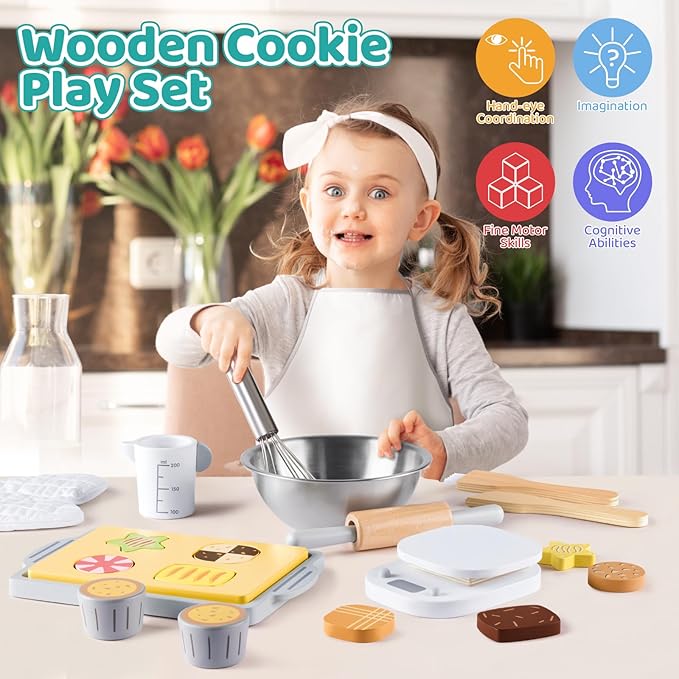 - 【MONTESSORI PLAY AND EDUCATIONAL TOYS】: This kids wooden toys inspires children ages 3+ pretend to bake, decorate, and serve cookies, encourages your children use their imagination and creativity to improve their color recognition, eye-hand coordination, intelligent learning, taking turns, sharing, grip strength, sorting, decoration skills and learn more about cooking. Children will be excited to put on the apron and enjoying for cooking chef pretend play, role play.