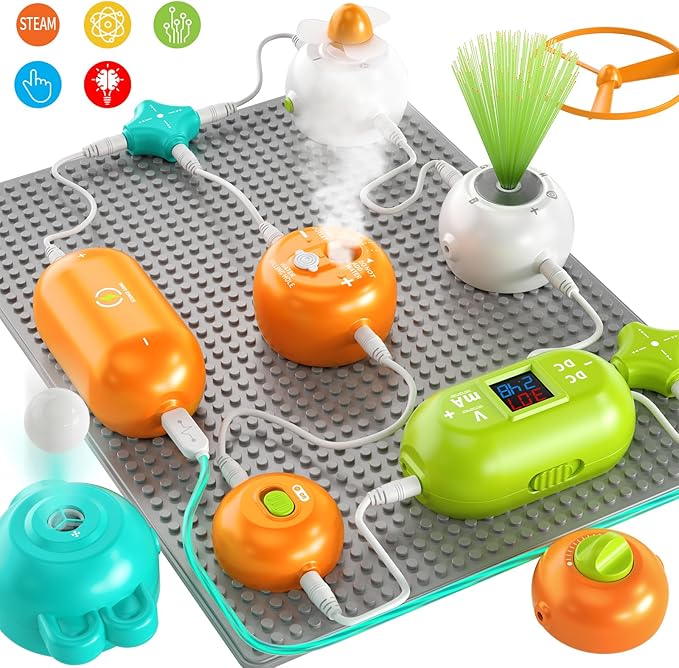 - Circuit Toy: This educational suit includes a base plate, powered host, modules (RGB light, fan, spray), on-off, optical fiber, wires, foam balls, scene cards, and more. Good for kids to experiment and explore elementary electrical circuits