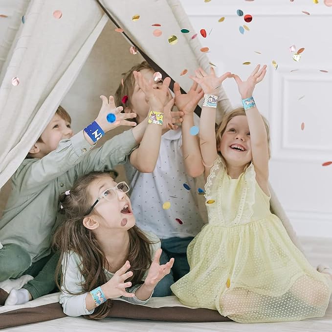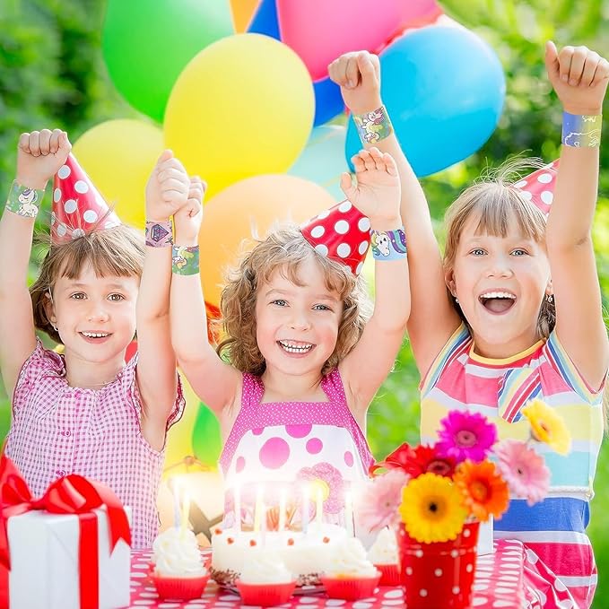 - 【Easy to Wear】 Enjoy the fun of popping from a straight strip to a wrist-hugging snap bracelets kids in an instant. Simply slap kids bracelets on your wrist & they will form a comfortable circle based on the size of your wrist. The bulk party favors for kids little girl bracelets will not break or scratch your skin and it is lightweight and comfortable, allowing you to wear cute slap bracelets for boys for an extended period of time. Kids age 3 and up are recommended.