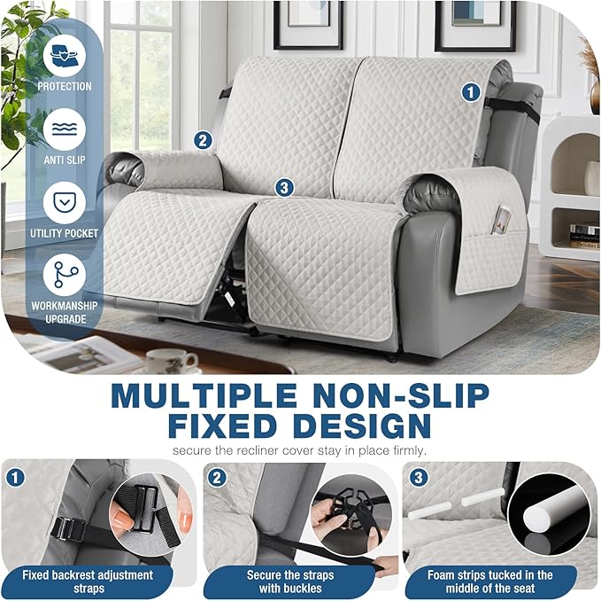 - 【REDUCE SLIP-OFF CONCEPT】 1.Solid round colloid design on the back of our recliner cover; 2.Additional flexible elastic straps and foam strips, 3.Two elastic straps on the bottom of the seat cover and matching buckles (only two)