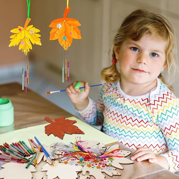 - Craft Project For Kids:Paint your favorite color on the unfinished wooden maple leaf ,and then go through the holes of wood chips and chime rods with a rope,and you will get a unique wind chime.These wooden chimes for outside will sway with the wind and made a joyful sound. Hanging wind chimes in the windows, doors and walls which emit more positive energy,a easy way to add some colors and a warm fall atmosphere.