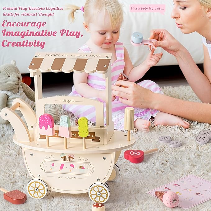 - [Pretend Play for Toddlers 3-5]: Wooden ice cream truck toy is designed to spark your child's imagination and promote language development through pretend play. This interactive set includes pretend ice cream, ice cream cones, and an adorable ice cream truck, providing endless opportunities for creative and educational play.