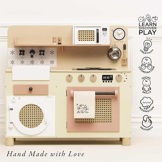 - SPARK INTERACTIVE AND IMAGINATIVE PLAY - Budding bakers and chefs will adore this stylish, retro style wooden kitchen, full of interactive features for hours of realistic play value. This scenario and role play toy encourages creative imagination, social and language development