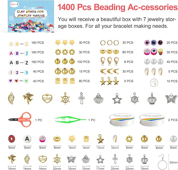 - Bracelet Making Kit: Contains 21600 pcs flat polymer clay beads in 144 colors and 1400 pcs charms kit(including 160 pcs each of black, gold, and colored letter beads, evil eyes beads, fruit beads, gold spacer beads, lobster clasp, etc.), 2 rolls of 10 meters stretchy strings,1 scissors, 1 plastic tweezers, 5 pairs of earrings, beads for jewelry making can meet your various DIY needs