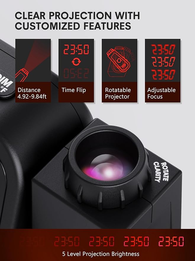 - 【Ceiling Projection Clock with 180°Swivel Projector and Adjustable Focus Ring】Enhance your bedroom or office with this sleek and modern digital alarm clock. It projects time on your bedroom wall or ceiling with clear and sharp digits, the swiveling arm allows for optimal positioning of 180°, ensuring easy viewing from any corner of the room, so you can easily check the time without turning your head.