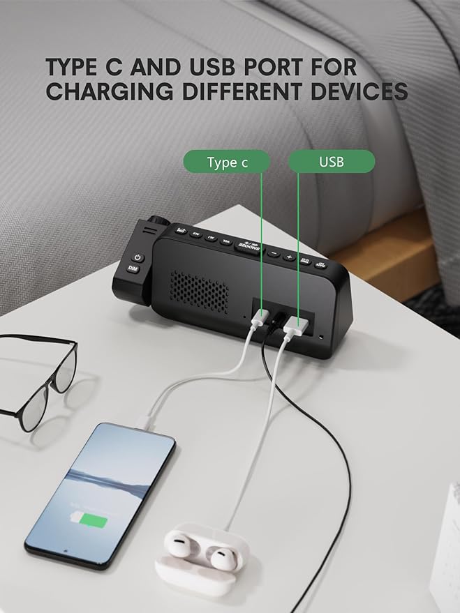- 【Memory Function & Dual USB Charger】This projector clock equipped with a Type-C and USB charging port for convenient charging of your phone while sleeping, helps reduce the number of outlets used in your bedroom, creating a neater environment. It also offers memory backup functionality using 2x AAA batteries (NOT included) to preserve time and alarm settings during power outages