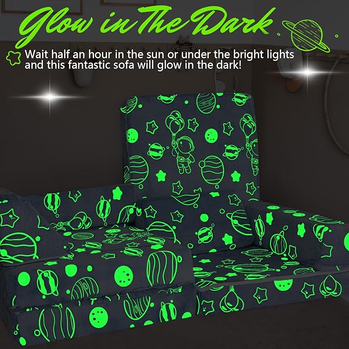 - [Unique Luminous Design] Place the kids couch under bright light for 10–15 minutes, then watch it glow in the dark—the brighter the light, the stronger the glow. Adds a magical touch to playtime and sparks imagination