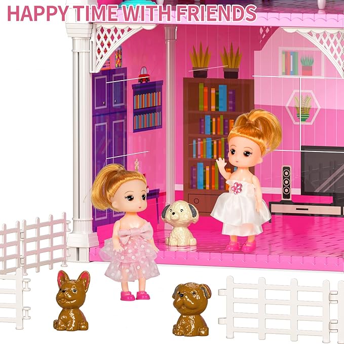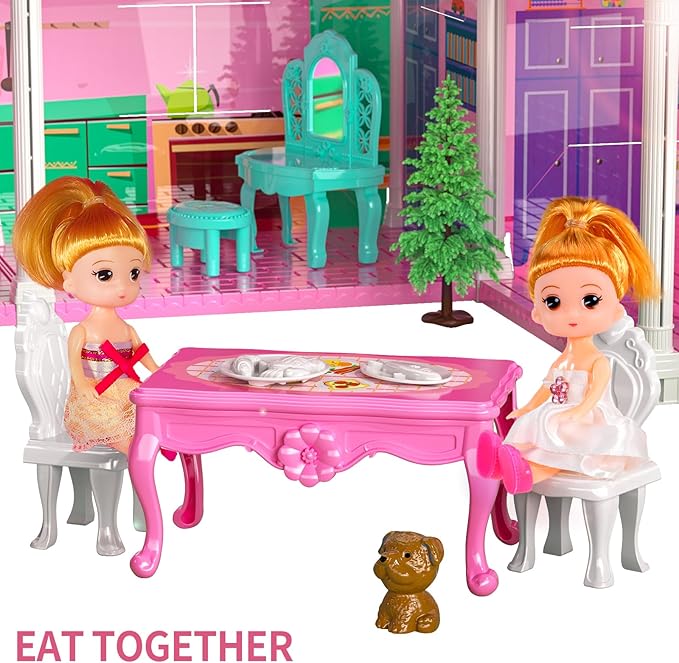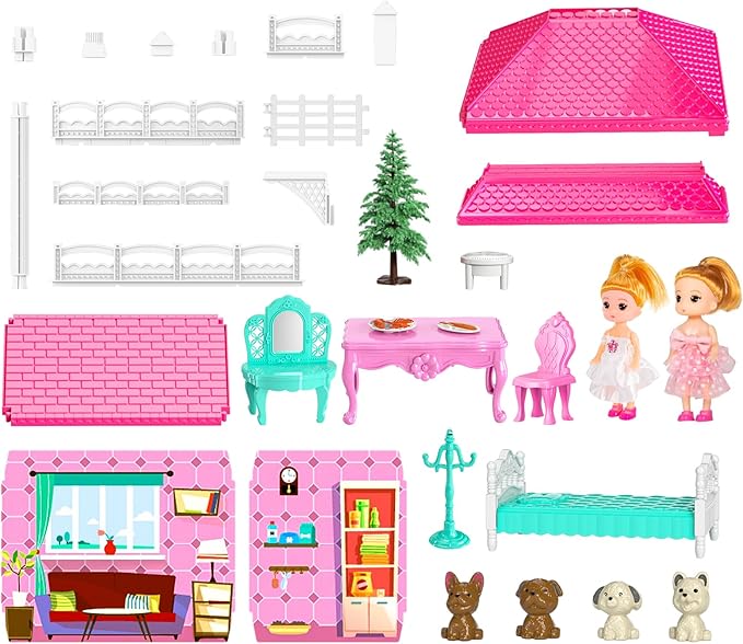 • Explore A Dolls' Toy: This villa playset(17.7*20.8*16.1 in) for kids features 2 storeys, 4 rooms, including family bathroom, sitting room, dining room, food toy and 2 doll toy figures, which encourages kids' hands-on ability to paly girls toys