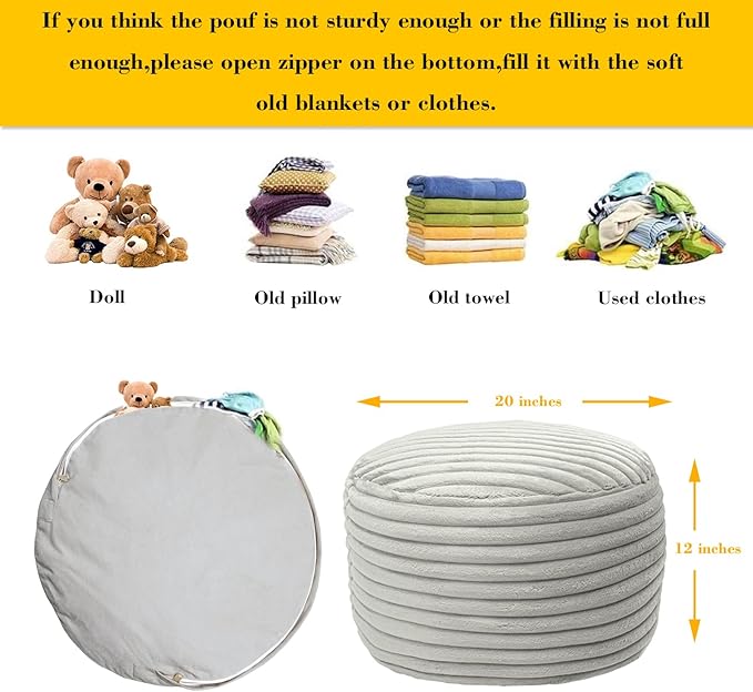 - 【Soft Plush Fiber Pouf Ottoman】Made of high quality plush fiber and anti-slip bottom, Tight and firm stitching ensures that our poufs are not damaged in daily use. Thickening zipper teeth is durable and easy for open and close.