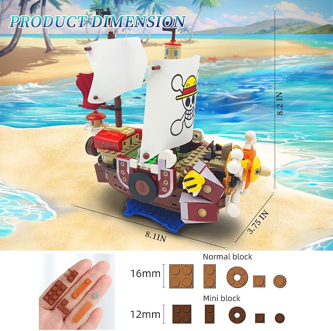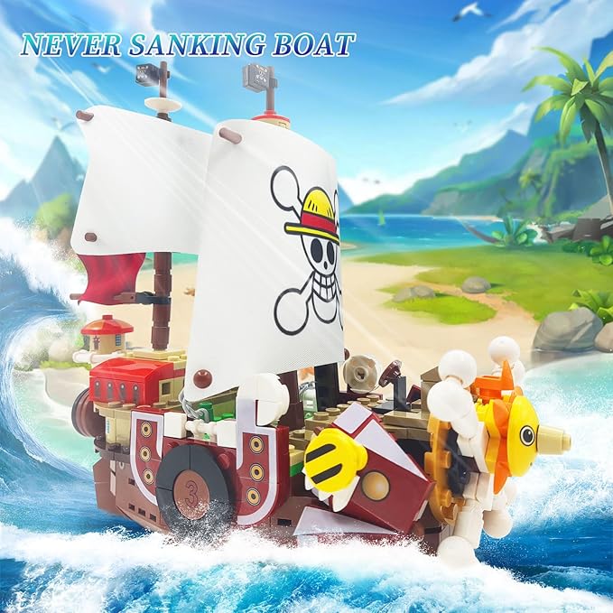 - 【Explore Anime One Piece】Build one piece pirate ship Thousand Sunny building kit set with skull pirate flag, adjustable mast, rotatable rudder, 9 main anime pirate figures and many realistic details. We recreate the ship on the sea scene in the anime of the One Piece.