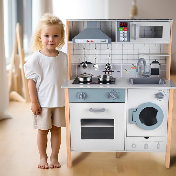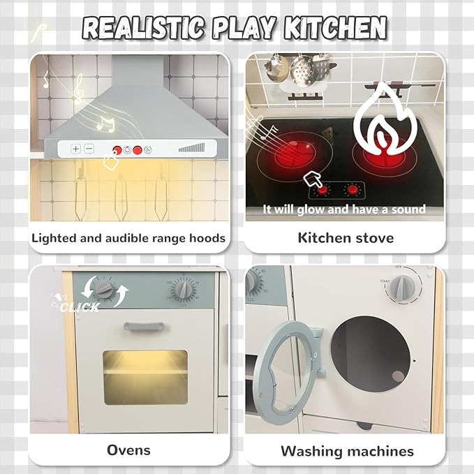 - Lots of Playable Features: The new model stove and range hood have a sim-life sound and lights with button control. Kids would get endless fun with this playable oven, refrigerator, microwave oven, faucet, and removable sink.