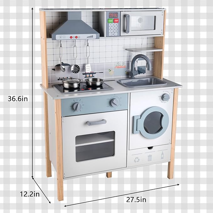 - Wooden Play Kitchen: Made of eco-friendly, solid wood, BPA-free. This space-friendly toy kitchen is 37in high and 27.5 in length after being assembled. Great for a cute nursery, let kids put the chef hat on and cook a meal for their guests.