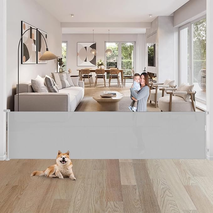 - [Perfect Fit Indoor and Outdoor] Retractable dog gate can be installed at bottom of stairways, doorways, hallways, deck, porch, patio indoor and outdoor.