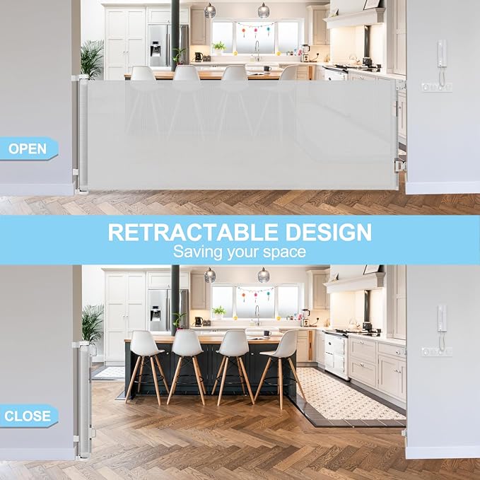 - [80" Extra Wide & Retractable Design] Extra wide retractable baby gates can be extended up to 80 inches wide and 33 inches tall. (Full size: 80"wide). Mesh can be completely retracted away when not in use.