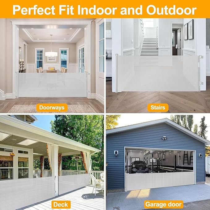 - [140 Inch Extra Wide Baby Gate ] This retractable baby gates Fits openings up to 140" wide and is 33" tall which can be adjusted to fit your openings according to your needs. Suitable for babies and dogs.