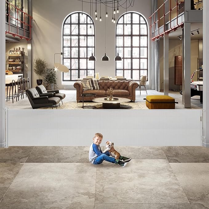 - [Retractable Gate ] You can roll it up when not in use, which saving your space. Unlike iron gate rails, this new retractable gate has no bottom rails - so there's no tripping hazard. Children and wheelchairs are easy to pass through, and elegant design works well with your home style. It is effective to stop your children from entering dangerous space.