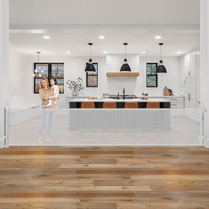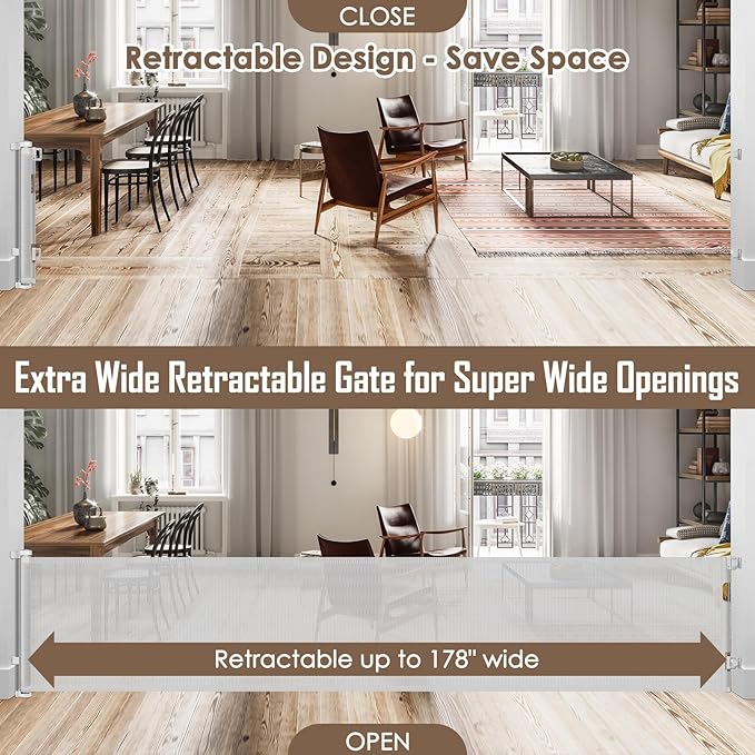 - One-Handed Use: This baby safety gate has a safety locking mechanism. Once locked, the mesh baby gate can be securely closed to prevent babies from accidentally opening it. Adults can easily open and close the retractable mesh gate with 1 hand for easy access.