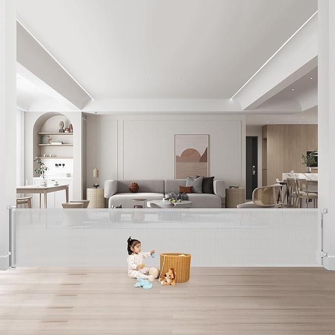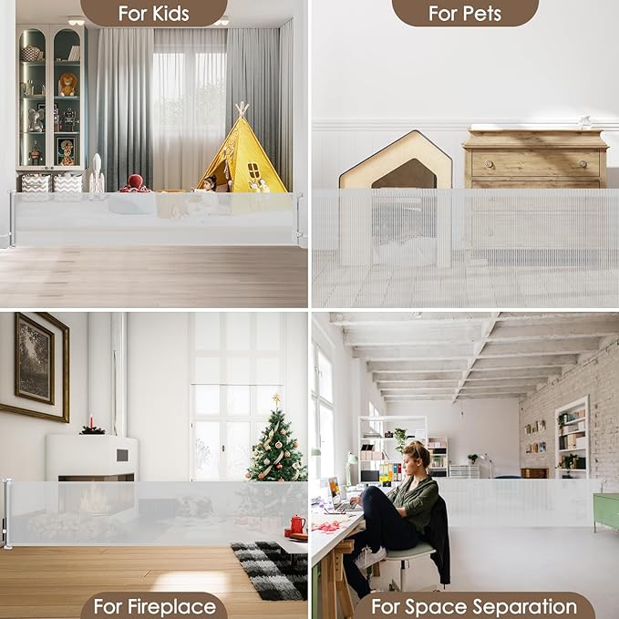 - Versatile Extra Wide Baby Gate: This retractable baby gates can be used as a baby fence, pet barrier, semi-enclosed baby play yards, fireplace gate and room divider, providing more options for homes with open floor plans or wide spaces, and also for your divide some space flexibly for babies and dogs.