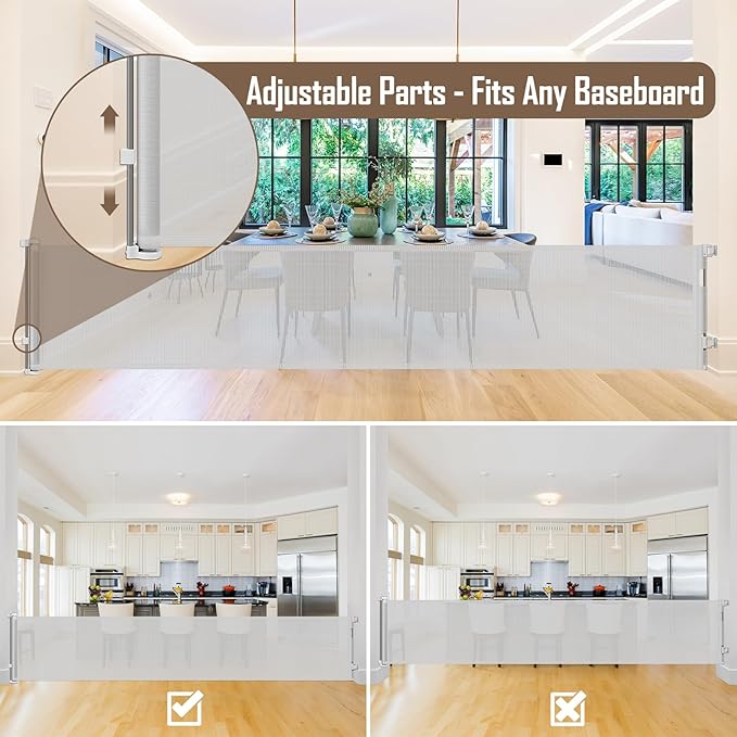 - Fits Any Height Baseboard Wall: The hardware of this retractable dog gate can be adjusted up and down, you can adjust the mounting hardware according to your baseboard height. Make retractable pet gate easier to install and more secure once installed.