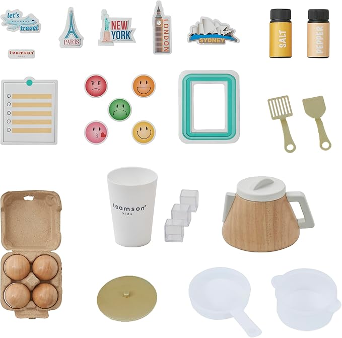 - (17) KITCHEN ACCESSORIES: a coffee pot, spatulas, pot & pan with lid, two seasoning bottles, a cup, three pretend ice cubes, 4 "crackable" eggs, two recycling bins and magnetic items for the refrigerator door
