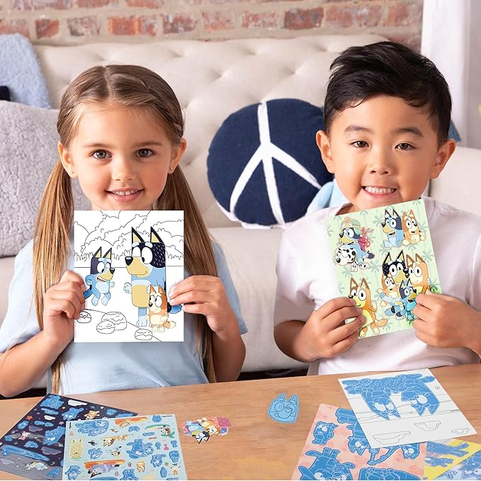 - ENDLESS BLUEY ADVENTURES: With a variety of scenes like sleepy time, home adventures, beach fun, and garden exploration, kids can mix & match stickers, punch-outs, and coloring sheets to create countless combinations for endless entertainment on car rides, during vacations, or even rainy days at home.