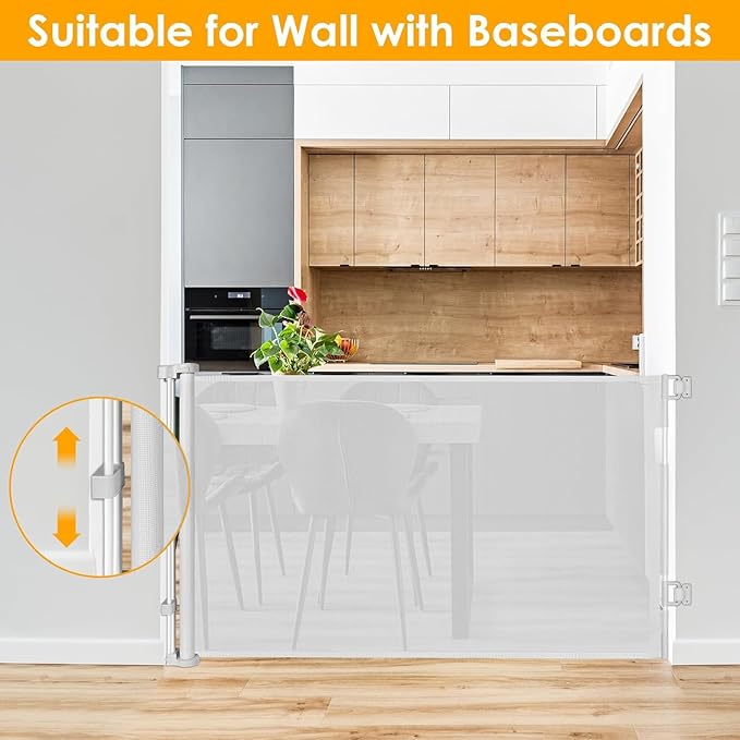 - [Fits Any Baseboard ] No need to buy extra spacers, our extra wide retractable pet gate accessories can be adjusted up and down to fit Any Baseboard.