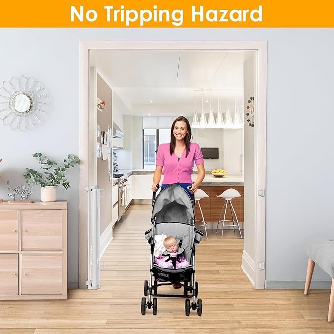 - [Retractable Gate ] You can roll it up when not in use, which saving your space. Unlike iron gate rails, this new retractable gate has no bottom rails - so there's no tripping hazard. Children and wheelchairs are easy to pass through, and elegant design works well with your home style. It is effective to stop your children from entering dangerous space.