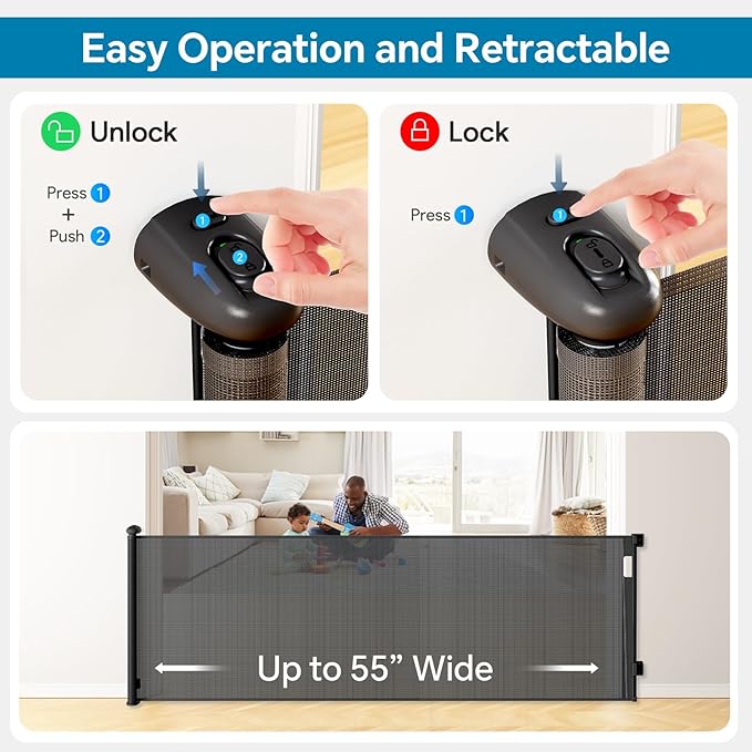 - 【Easy Operation Retractable Gate】Easy to use with just one hand, simply press and push the button to lock and unlock the safety gate, even when you're holding your baby or carrying toys and diapers, baby gate retracted away when not in use, saving space