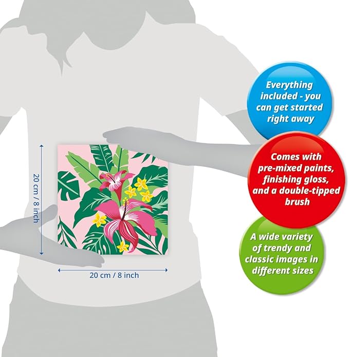 - Everything Included: Water-based acrylic paints in resealable pots, 1 packet of finishing gloss, 1 double-tipped brush, 2 paint holder palettes,1 cardboard canvas, 1 painting reference guide, 1 set of simple instructions, and 1 picture hanger.