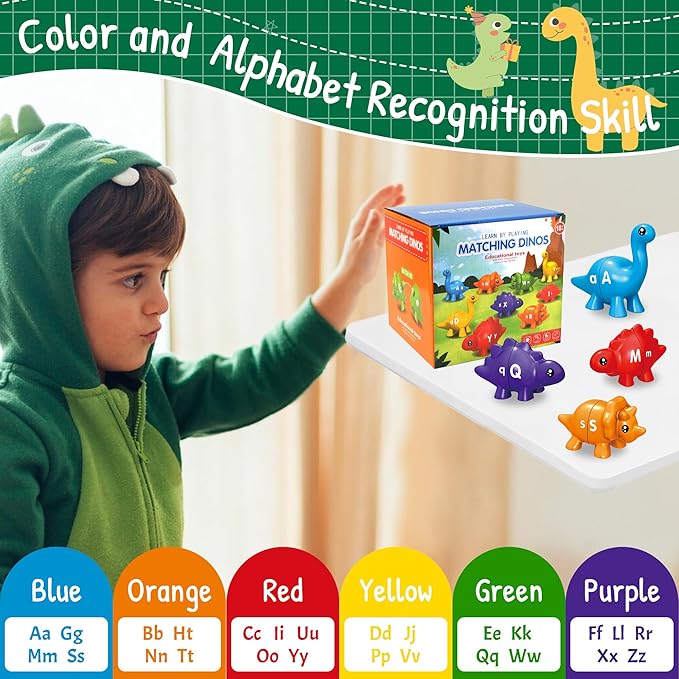 - Preschool Learning Activities: Toddlers learn alphabet and early color matching every time they find and match the dinos. It also helps children develop fine motor skills and hand-eye coordination and build essential preschool language abilities.