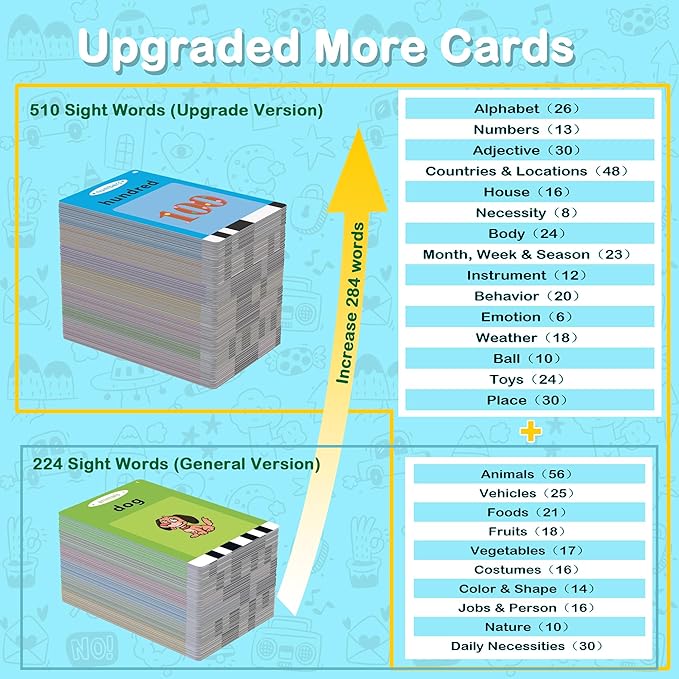- ✅[Toddler Flash Cards] -𝐔𝐩𝐝𝐚𝐭𝐞𝐝 𝐕𝐞𝐫𝐬𝐢𝐨𝐧, 𝐈𝐧𝐜𝐫𝐞𝐬𝐞 𝟐𝟖𝟔 𝐍𝐞𝐰 𝐖𝐨𝐫𝐝𝐬. Rich card content, talking flash cards for toddlers contains 510 sight words, covering 31 Themes, including animals, vehicles, character, food and more. Expose the toddler to numerous unfamiliar objects to foster imagination and cognitive development.