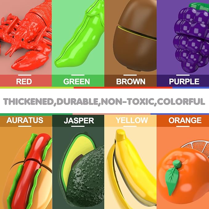 - 45 items pretend kitchen sets: 32 varies of play fruits, fast food and Vegetables(can be cut in 81 pieces and reattached), a grocery store basket, and play kitchen accessories. The kids can also experience the “peel” them like egg, corn, banana, crab...