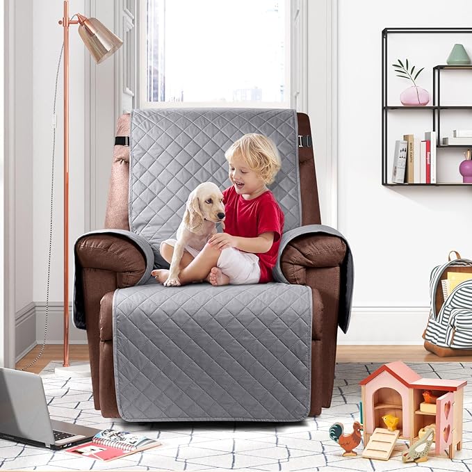 KinCam 100% Waterproof Recliner Chair Cover, Reclining Couch Covers for Pets, Dogs, Recliner Couch Slipcover Furniture Protector with Elastic Straps for Kids(28", Light Gray)