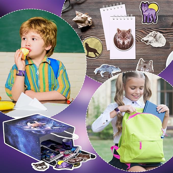 - Wolf Birthday Party Supplies: package includes 12 wolf paper bags with handles, 12 spiral wolf mini notebooks, 12 wolf keychains, 12 wolf slap bracelets and 50 wolf stickers; Enough quantity and delicate combination to meet your parties gifting demands
