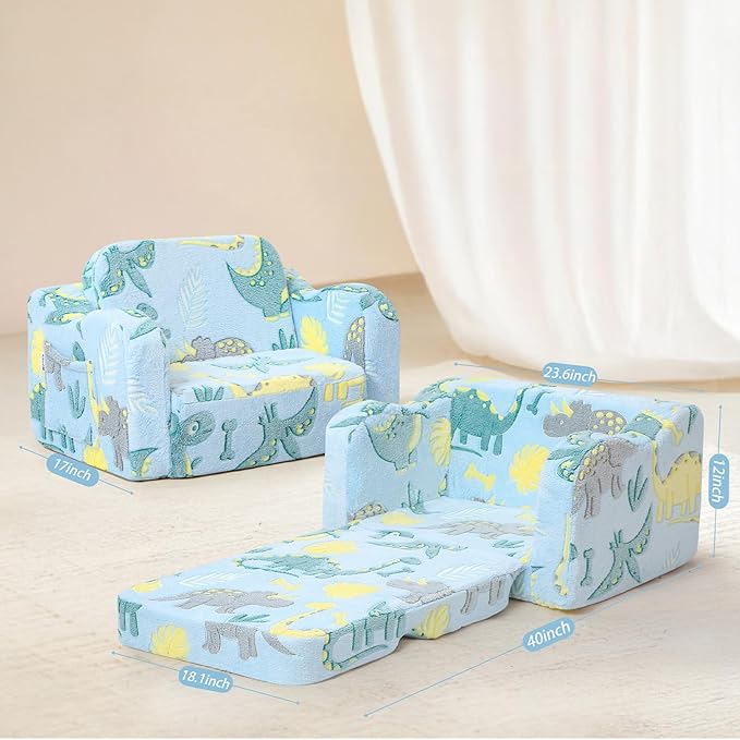 - 2-in-1 Design: This multifunctional fold-out chair easily transforms into a toddler lounger sofa. Sit or lie down comfortably with the thick plush fabric and supportive foam