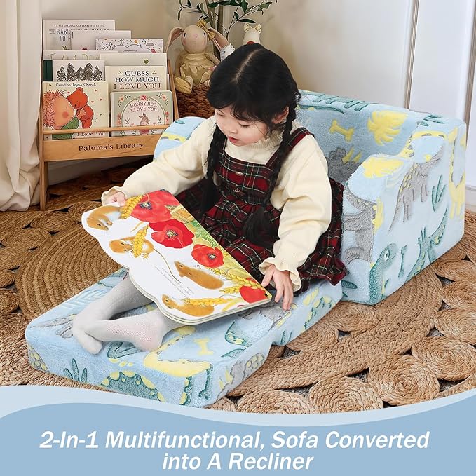 - Glow-in-the-Dark Feature: Unique lighting design with a cute dinosaur pattern. Place the toddler sofa in bright light or sunlight for 10-15 minutes to activate the glow. The brighter the light exposure, the stronger the glow effect. Ideal as a birthday, Christmas, or baby shower gift