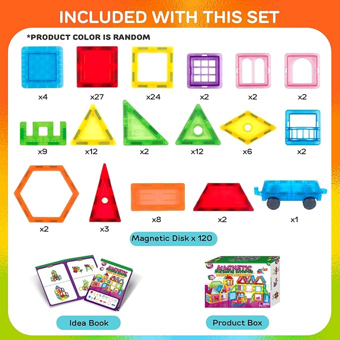 - Sparking Creativity: This 120-piece set of kids rainbow magnetic tiles for toddlers age 3-5 will ignite your child's imagination and encourage them to create countless structures, shapes, and designs. Moreover, as kids manipulate with this toy magnets, they enhance their fine motor skills and hand-eye coordination, which will be a perfect Christmas gift toys for any Kids!