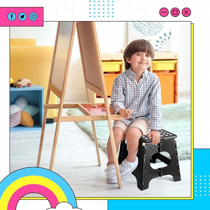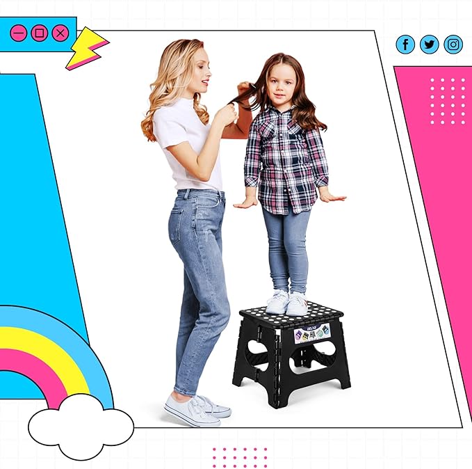 - Sturdy Folding Stool: The internal structural design 11 inch folding step stool in Black is unique makes the stool extra strong and safe. It can hold up to 300 lbs Max !!! Which is mainly used for kids indoor sitting. Please make sure the step stool is fully opened before use