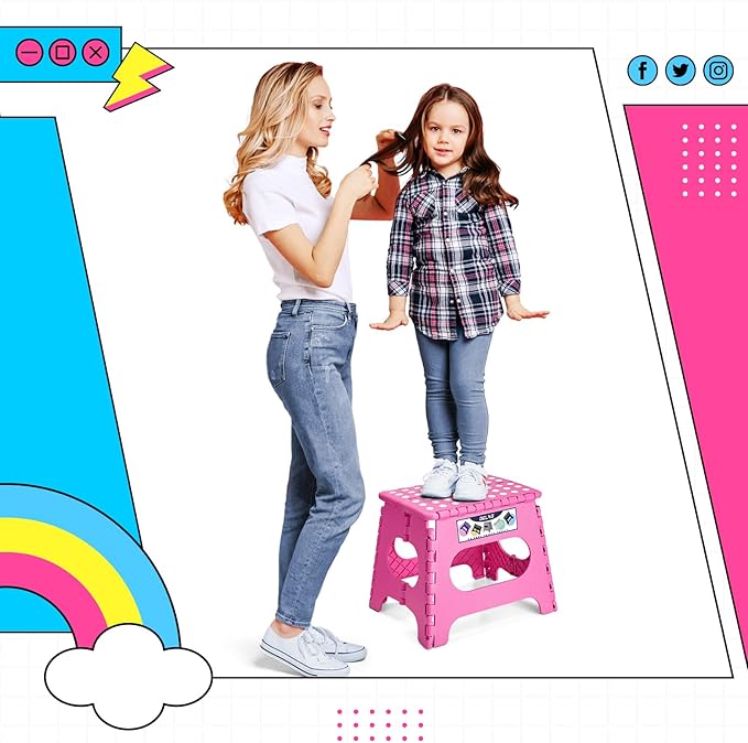 • Sturdy Folding Stool : The internal structural design 11 inch folding step stool in Pink is unique makes the stool extra strong and safe. It can hold up to 300 lbs Max !!! Which is mainly used for kids indoor sitting. Please make sure the step stool is fully opened before use