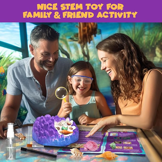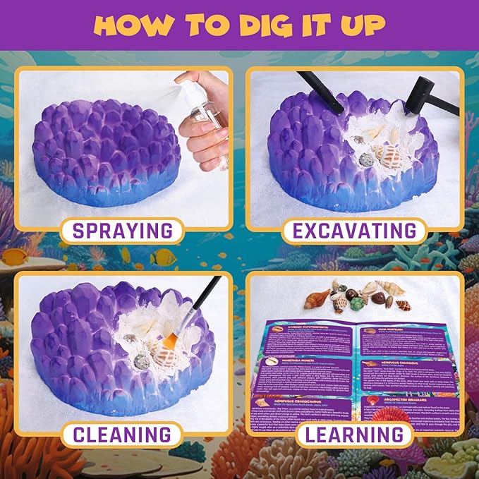 - SAFETY SEA LIFE DIGGING KIT: This excavation kit includes essential tools such as a spray bottle for easy excavation and safety goggles for eye protection, all made from non-toxic materials like gypsum. Designed for interactive discovery, it lets children safely uncover ocean fossils with tools perfect for small hands