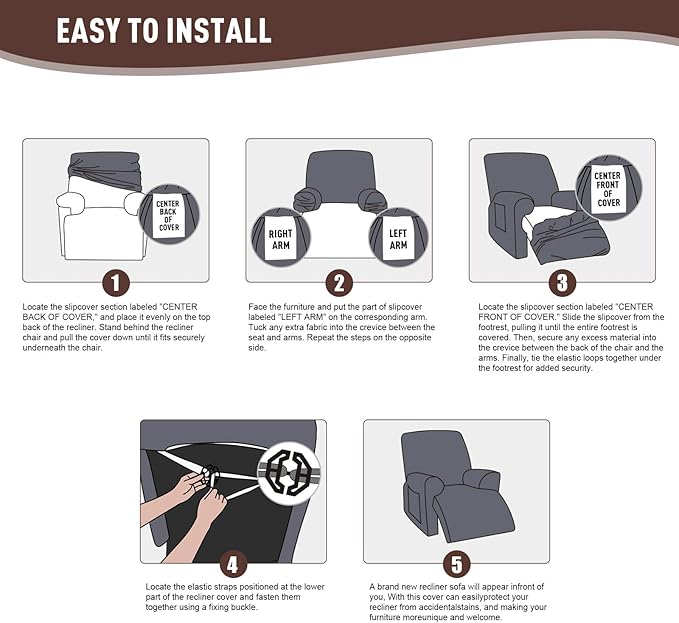 • EASY TO INSTALL: Our recliner sofa slipcovers have exquisite workmanship, including 2 pieces arm covers, 1 piece seat cover and 1 piece back seat cover, 4 pieces cover totally. The recliner covers also equips with bottom elastic and reinforcement straps, you can use buckle to make the cover in place without moving.