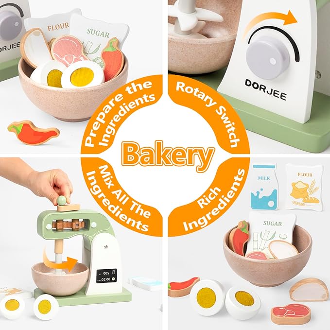 - 🎁Kids Wooden Mixer Accessories: Dorjee toy mixer set contains 1mixer, 2 knives, 1 bowel, 1 egg, 1 flour, milk, 1 sugar, 2 pcs of meat, chilli and garlic. Kids will have much more fun in playing this kitchen mixer with friends or parents.