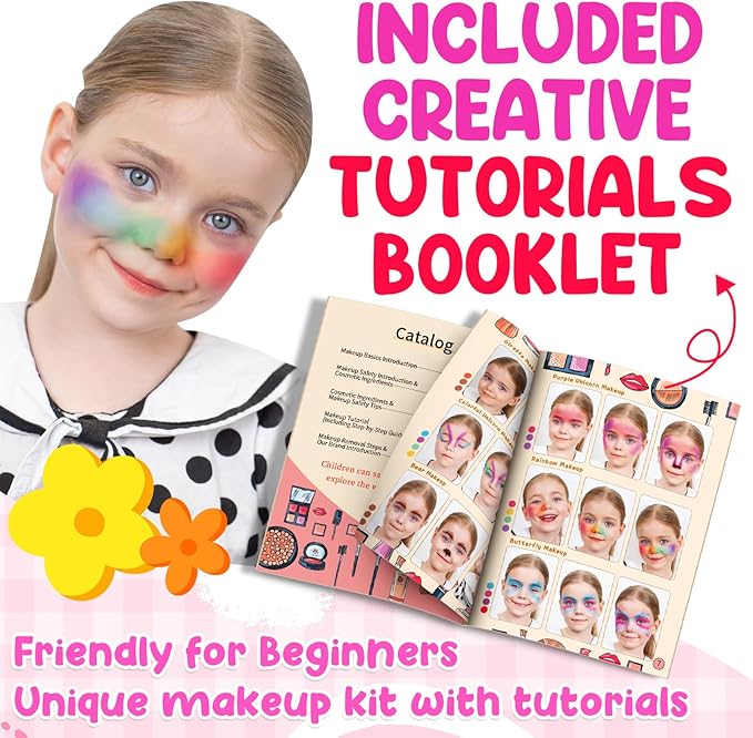 • 【Easy to Store & Mess-free Makeup】: This is a compact pink makeup set for girls, all the items come packed in a neat carrying case for easy storage. There are fixed colors in the cosmetic case, children can see all the colors at a glance so that they can choose favourite color, and it's not easy to lose and avoid breaking during carrying