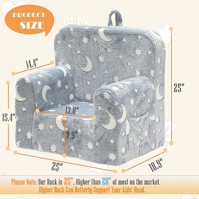 - đŤăGLOW IN THE DARK MOON TODDLER ARMCHAIRă⤠Expose SUFUS Glow in The Dark Toddler Chair Couch to a bright light or daylight, then turn off the lights at night and watch the magic happen! The glow light can create a dreamy atmosphere in your bedroom, as if you were floating in the universe and surrounded by the stars and moons, How incredible and amazing!