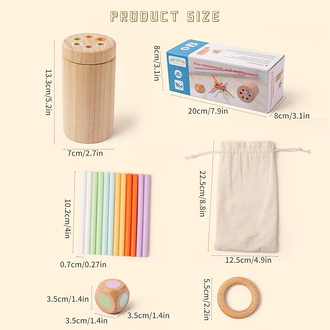- GOOD QUALITY AND HIGH SAFETY:The sensory toys for toddlers 1-3 is made of natural quality wood; the wooden toy use of safe and non-toxic environmentally friendly water-based paint, the surface of the toy is smooth and rounded with no burrs, which won't cause any harm to your toddler.More importantly the wooden stick is 4 inches long, the wooden ring is 2.2 inches in diameter, and the dice are 1.4 inches in diameter, which avoids the risk of swallowing by babies from 6 month to 3 years old