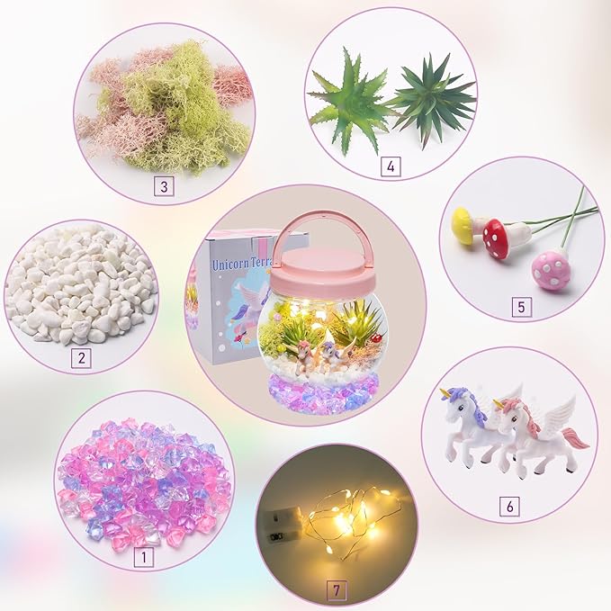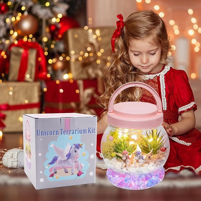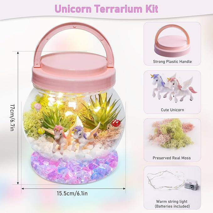 - đăUnicorn Terrarium Kit for KidsăIt is a miniature faux unicorn garden within a container that simulates a natural environment. Comes with all you need to create your own unicorn garden in a jar. It fascinates children as soon as they pull it out of the box and is a perfect family project. The assembly is fun, and the final result is immensely satisfying.
