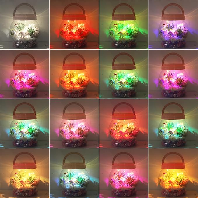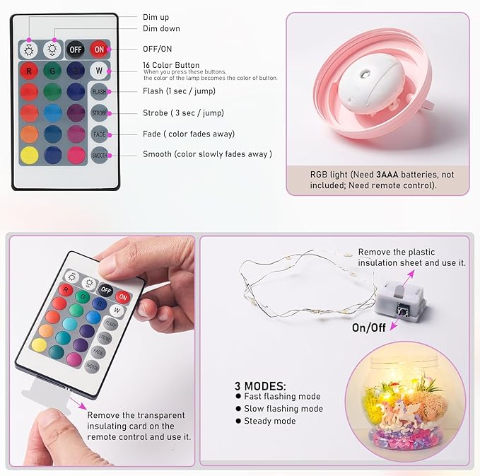 - đăBeautiful Lights ăOur unicorn aquarium kit includes 1 RGB light (not included 3AAA batteries), 16 colors to choose from and 4 light modes, use the remote control to select color and light mode. Also has an LED string light (included 3 LR44 batteries) with 3 modes. Your kids will be thrilled to discover how pretty the unicorn light-up terrarium is.